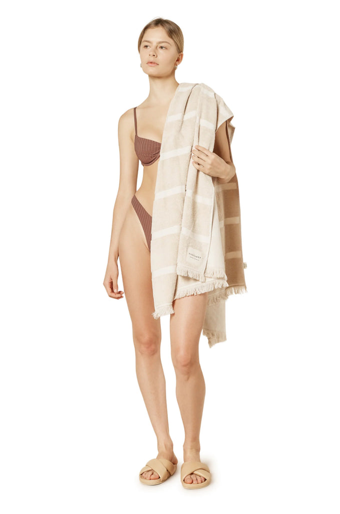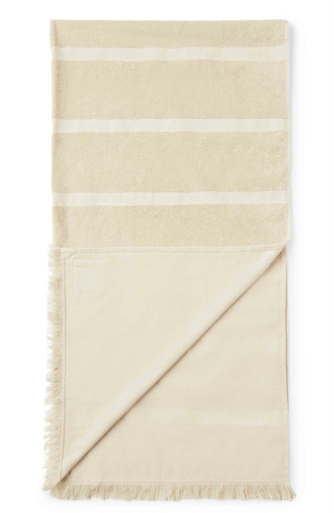 A premium extra-large towel hand-loomed in Turkey. Crafted from a heavyweight soft cotton terry with woven stripes and a flat back for fast drying and absorbent qualities.
