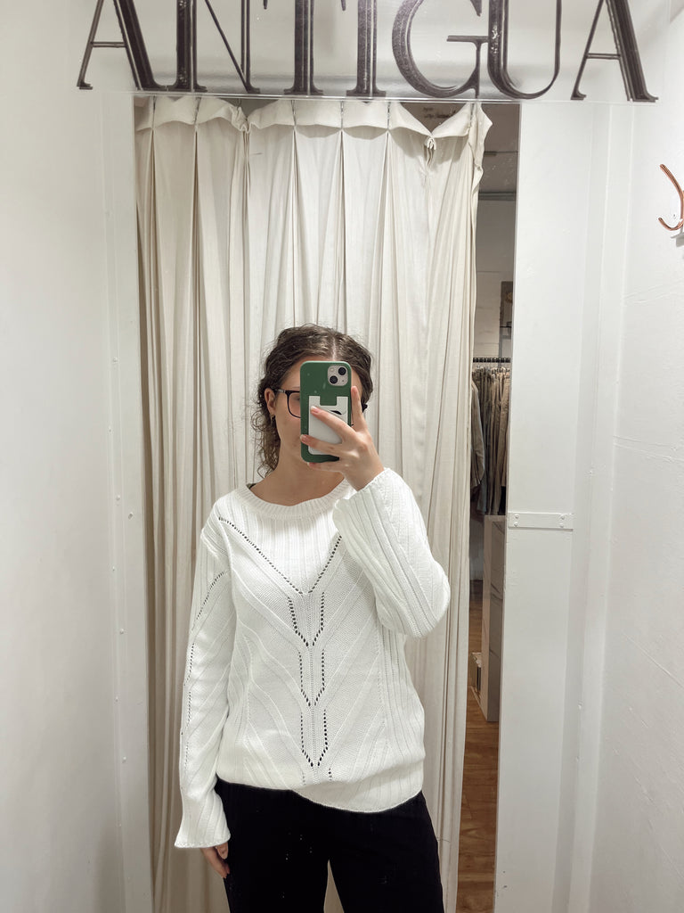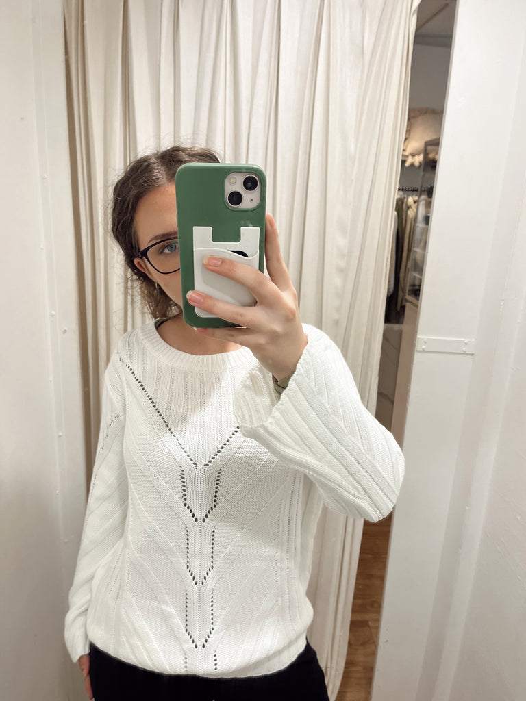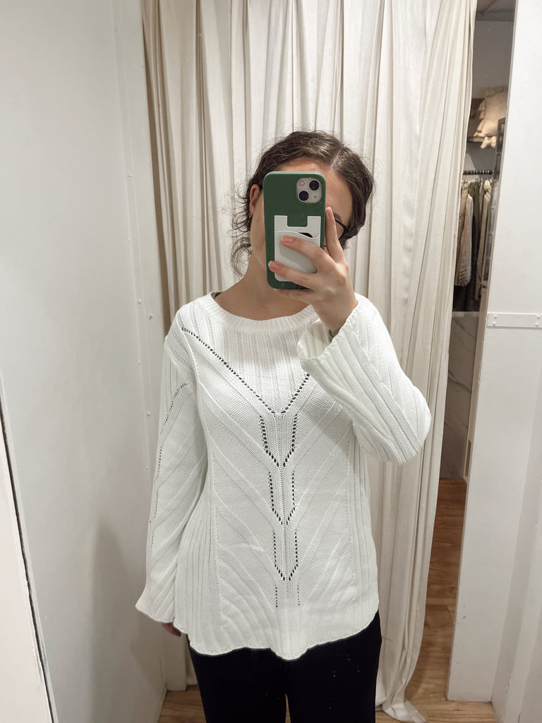 Light knit top with triangle feature design. Sleeves feature a balloon fit, flaring out towards the end.